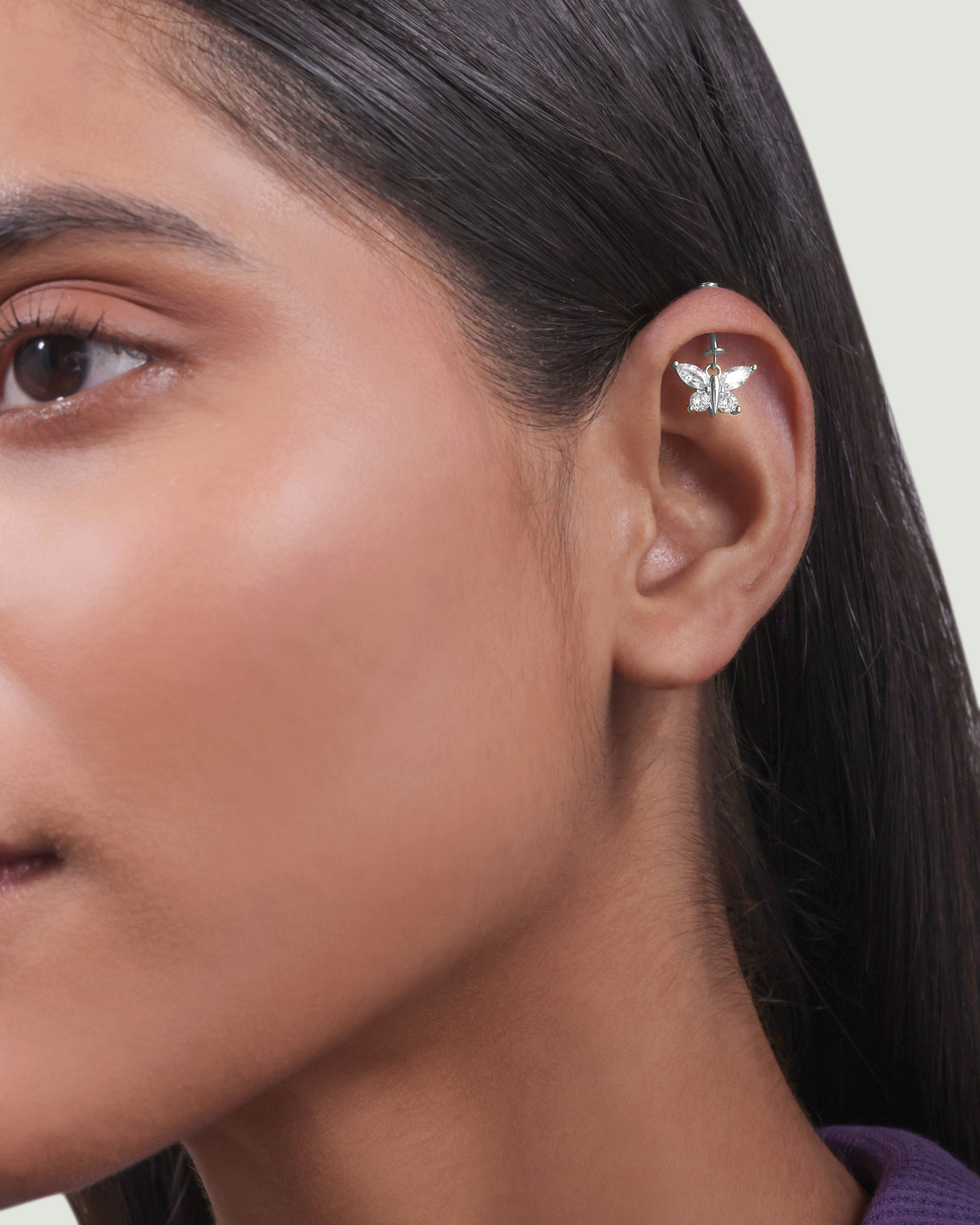 Four Marquise Butterfly Helix Hanging Earrings in 92.5 sterling silver with rhodium plating and 5A+ zirconia stones. The delicate marquise butterfly design adds charm, movement, and sparkle to helix piercings, ideal for layering, gifting, or adding a whimsical accent to your ear jewelry collection.