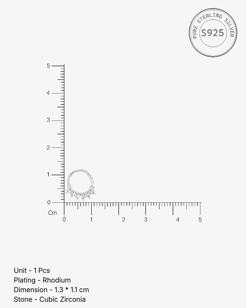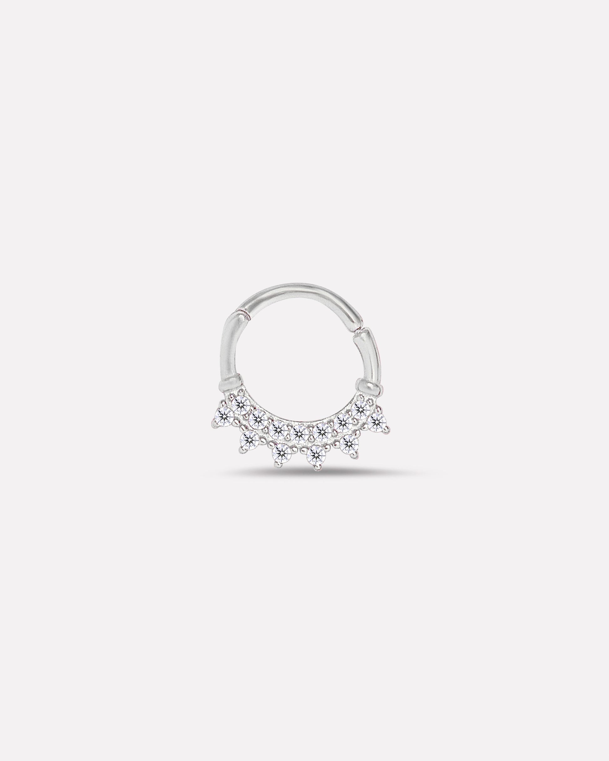 Stylish Septum Ring crafted in 92.5% Silver, adorned with sparkling 5A+ Zirconia stones, and plated in luxurious Rhodium plating. Hypoallergenic and comfortable, this piece adds elegance and a touch of glamour to any look—perfect for daily wear or special occasions.