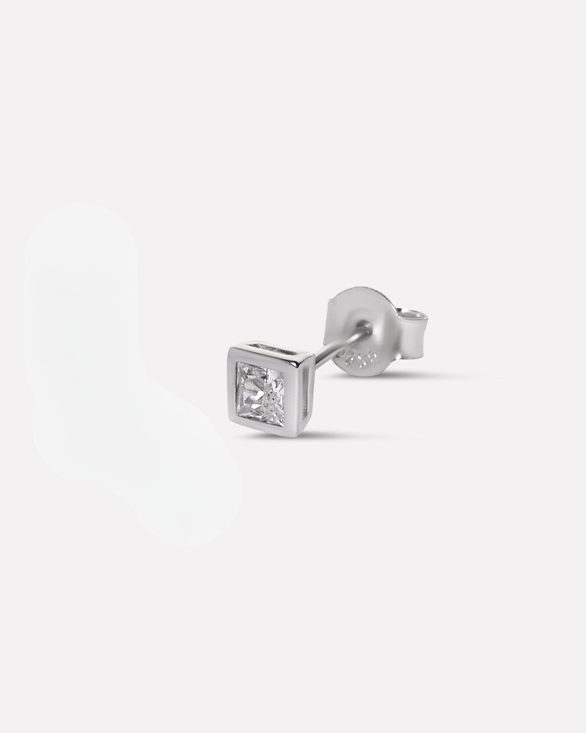 Mini Square Solitaire Stud Men's Earrings in 92.5 sterling silver with 5A+ zirconia stones. Rhodium plated for brilliance, these sleek studs feature a minimalist square design, perfect for everyday wear or subtle elegance.