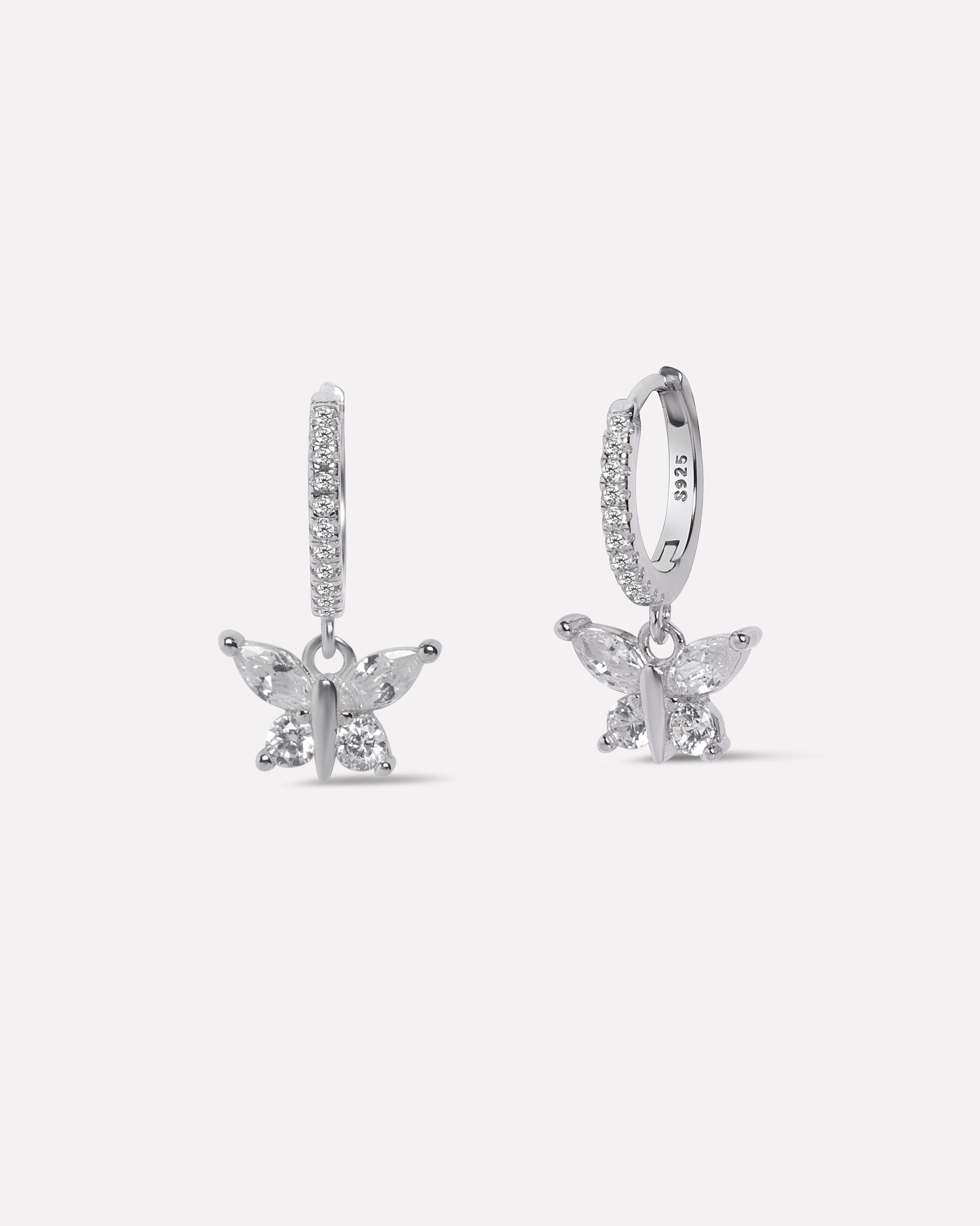 Delicate Radiant Butterfly hoops in 92.5 silver, rhodium plated with 5A+ zirconia stones. The butterfly motif adds whimsical elegance and sparkle. Ideal for layering or gifting to someone who loves playful, feminine designs.