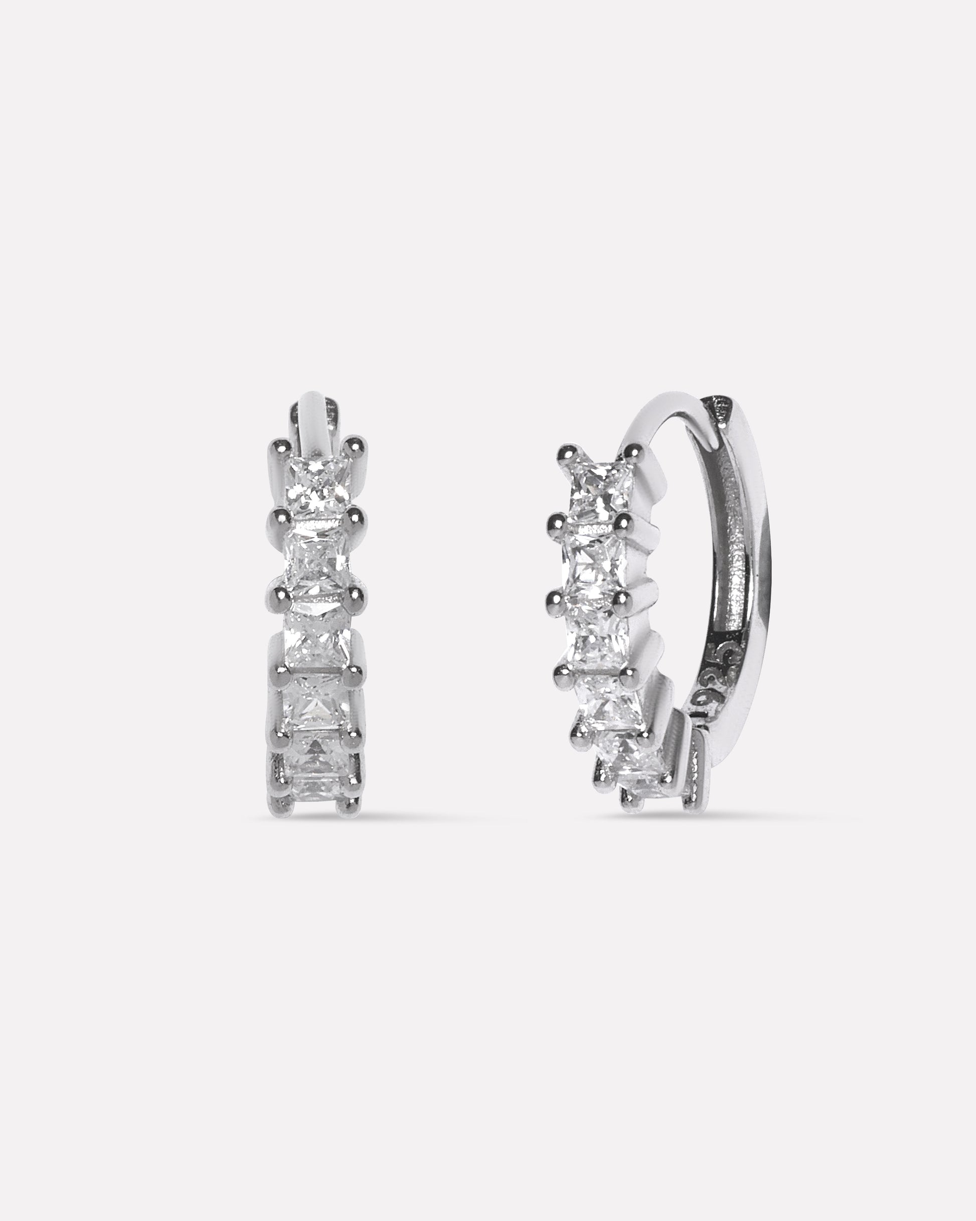 Elegant Regal Radiance hoops in 92.5 silver, rhodium plated with 5A+ zirconia stones. These statement hoops provide sophisticated shine and versatility, perfect for stacking, gifting, or wearing solo to turn heads.