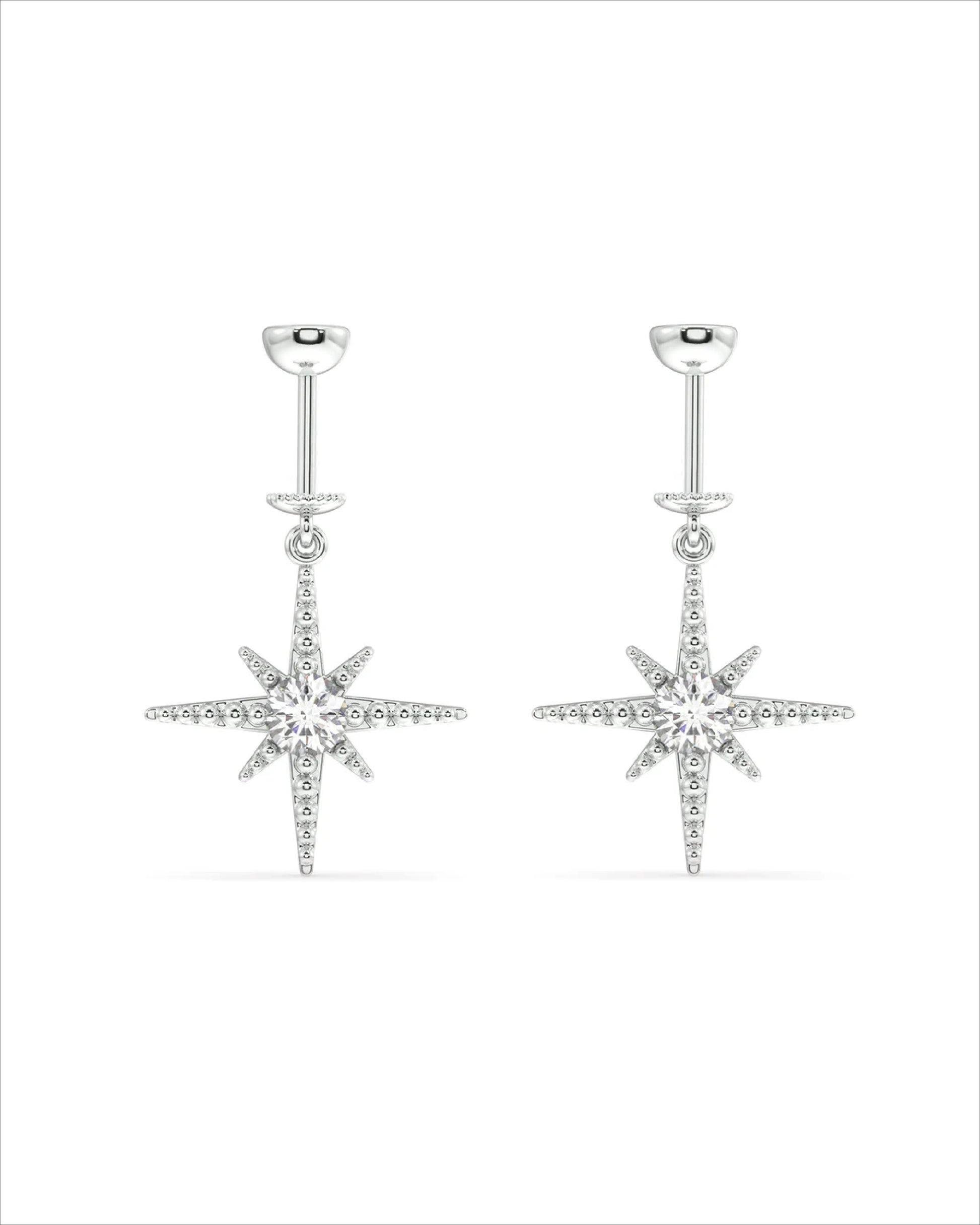 Zirconia Snow Burst Screw Helix Earrings in 92.5 sterling silver with rhodium plating and 5A+ zirconia stones. Snow burst motif adorned with sparkling zirconia offers luminous elegance, flowing movement, and radiant charm for helix piercings or layered ear styling.