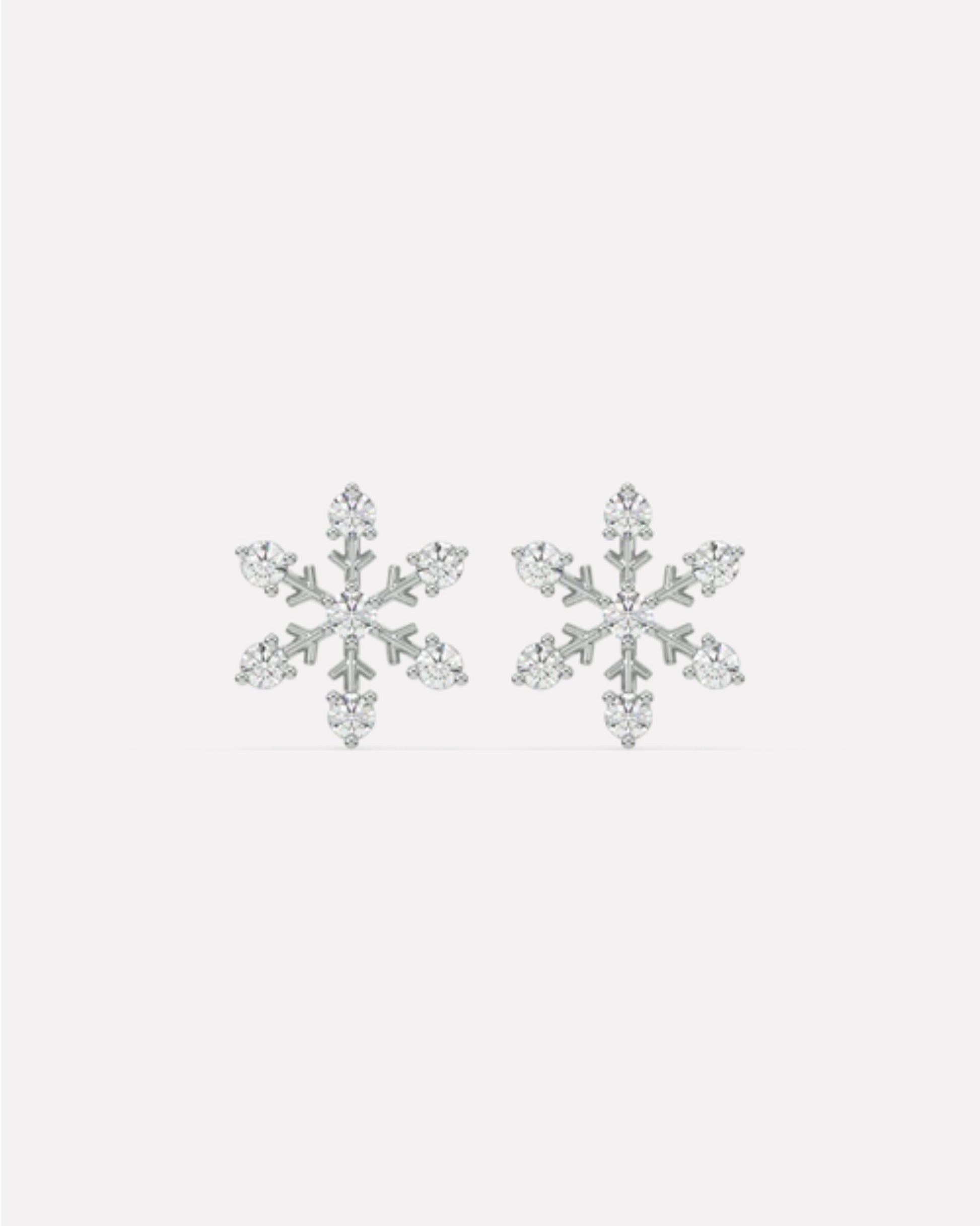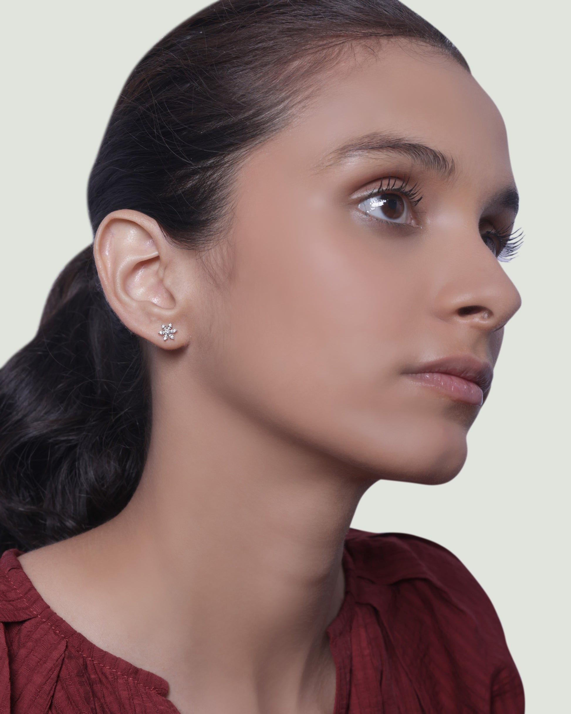 Snowflake Stud Earrings in 92.5 silver with rhodium plating and 5A+ zirconia stones. Intricate snowflake design with sparkling details for elegant winter-inspired or daily wear.