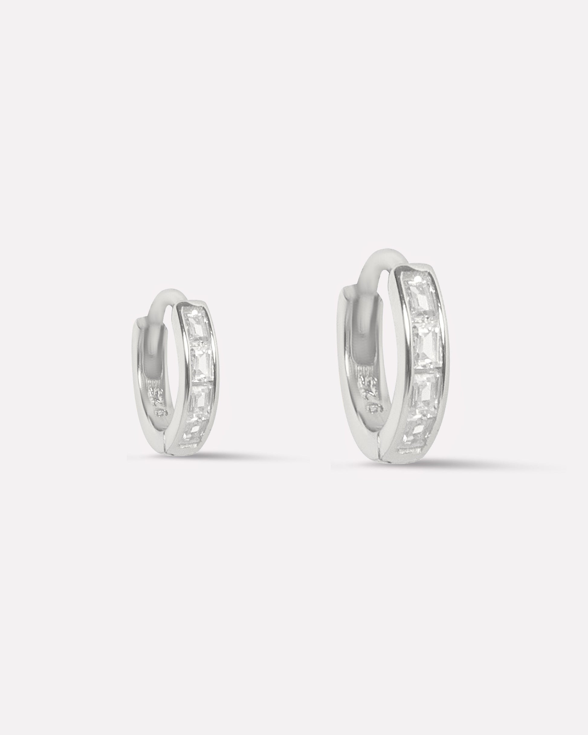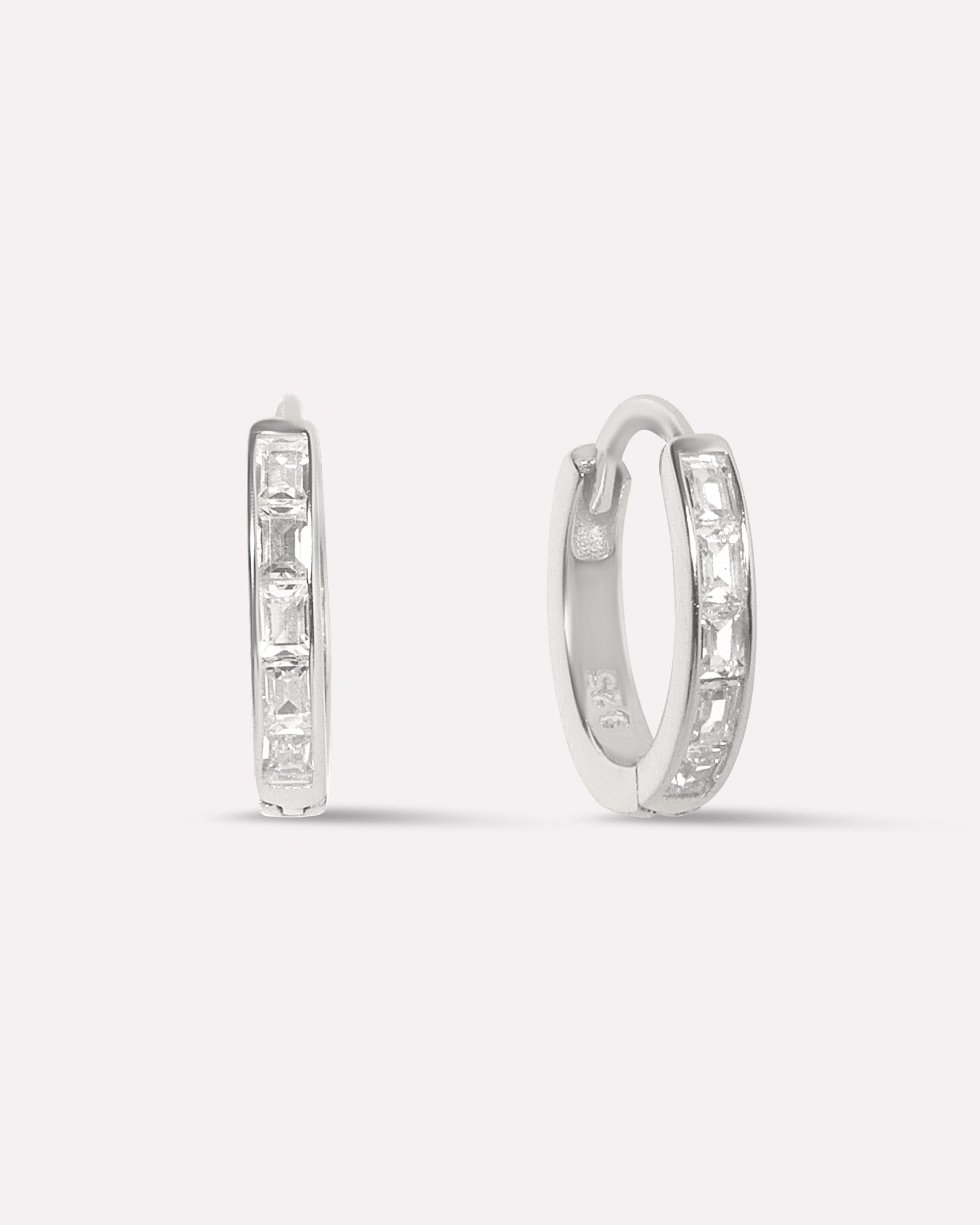 Radiant Statement Baguette Round hoops in 92.5 silver, rhodium plated with 5A+ zirconia stones. The sparkling baguette stones offer contemporary elegance and eye-catching shine.