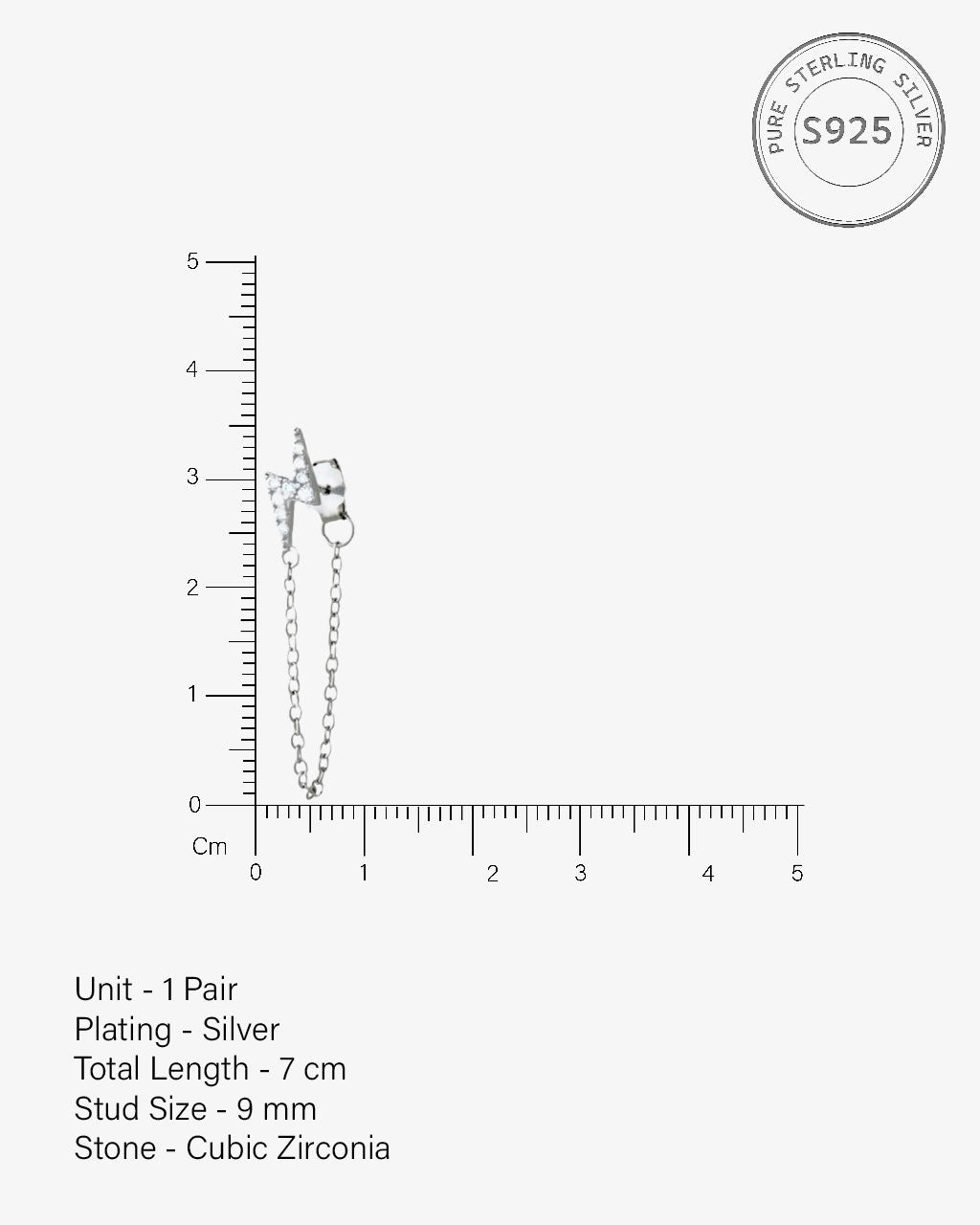 Thunder Dangler Chain Earrings in 92.5 sterling silver with 5A+ zirconia stones. Rhodium plated, featuring a sleek thunder-inspired dangling design on a chain, perfect for edgy style, layering, or gifting.