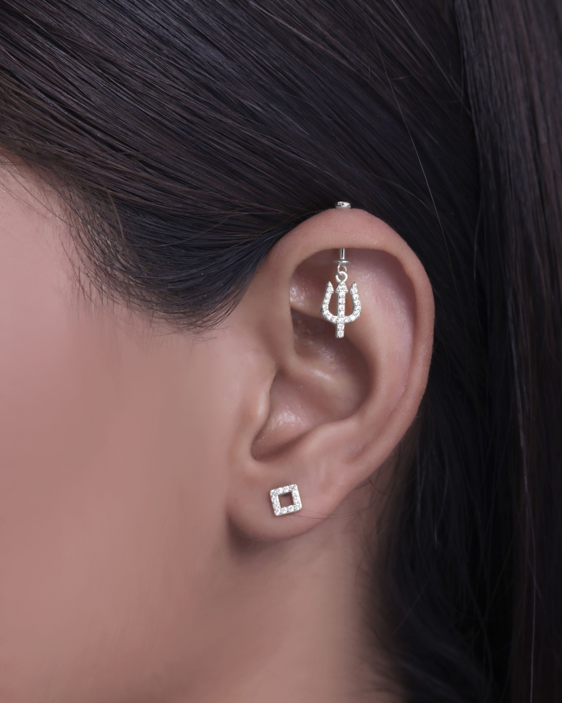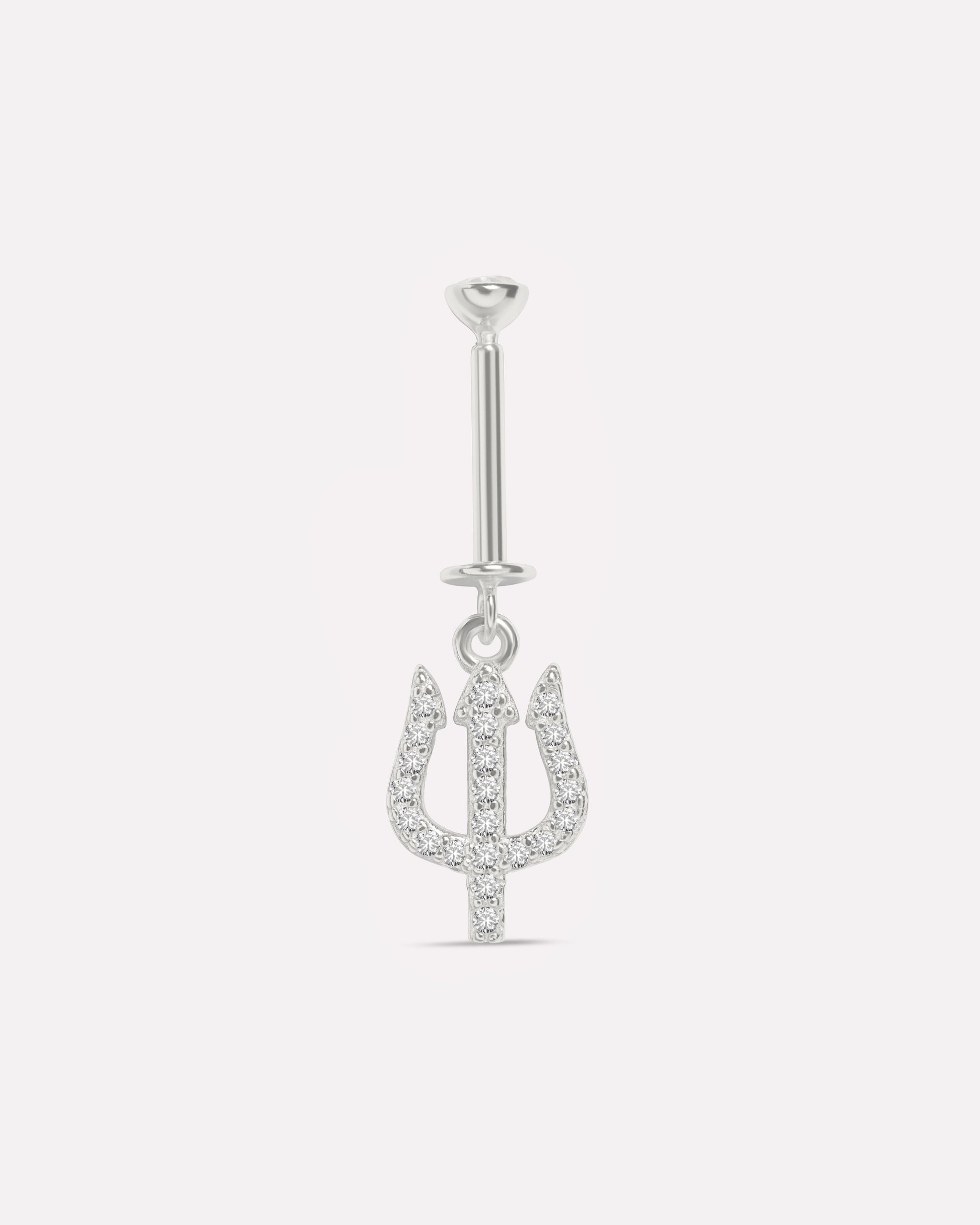 Trisul Helix Piercings Hanging Earrings in 92.5 sterling silver with rhodium plating and 5A+ zirconia stones. Trident-inspired design glimmers with sparkling detail and fluid movement, bringing symbolic charm, edgy elegance, and refined style to helix piercings, perfect for layered looks or gifting.