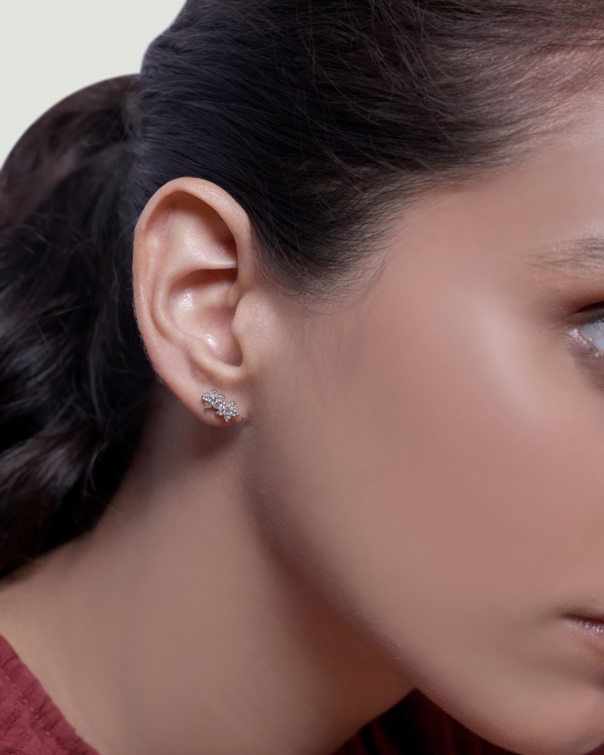 Twin Flower Zircon Studs in 92.5 silver with rhodium plating. Pave-set 5A+ zirconia stones create a charming twin-flower design for daily wear or gifting.