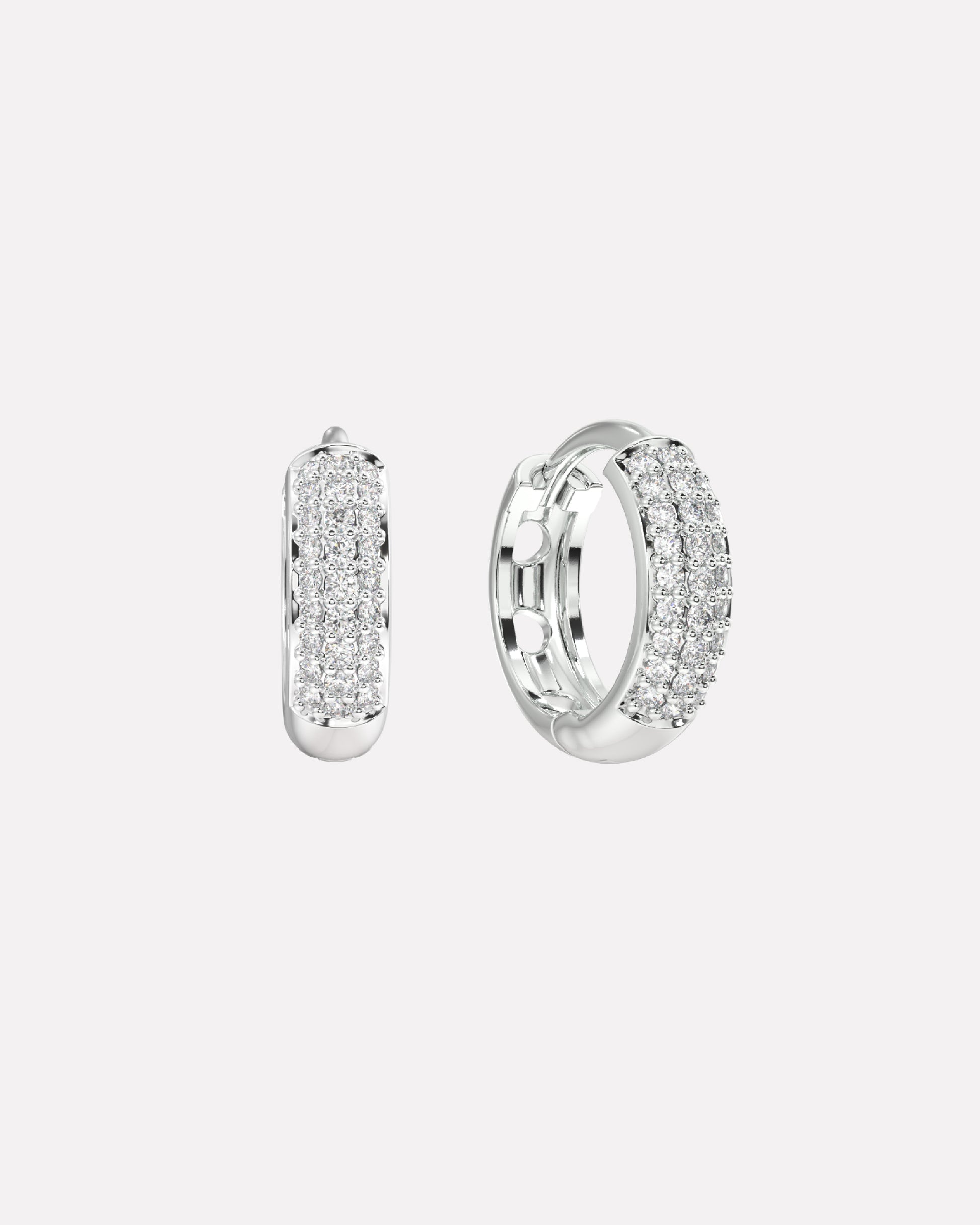 These Rhodium-Plated Zirconia Thick Hoops in 92.5 silver feature multiple size options to suit your styling needs. Adorned with sparkling 5A+ zirconia stones, they are perfect for stacking or wearing individually for a subtle yet glamorous touch. Lightweight and comfortable, these earrings offer versatile elegance that transitions seamlessly from day to night, adding sophistication and sparkle to any outfit.