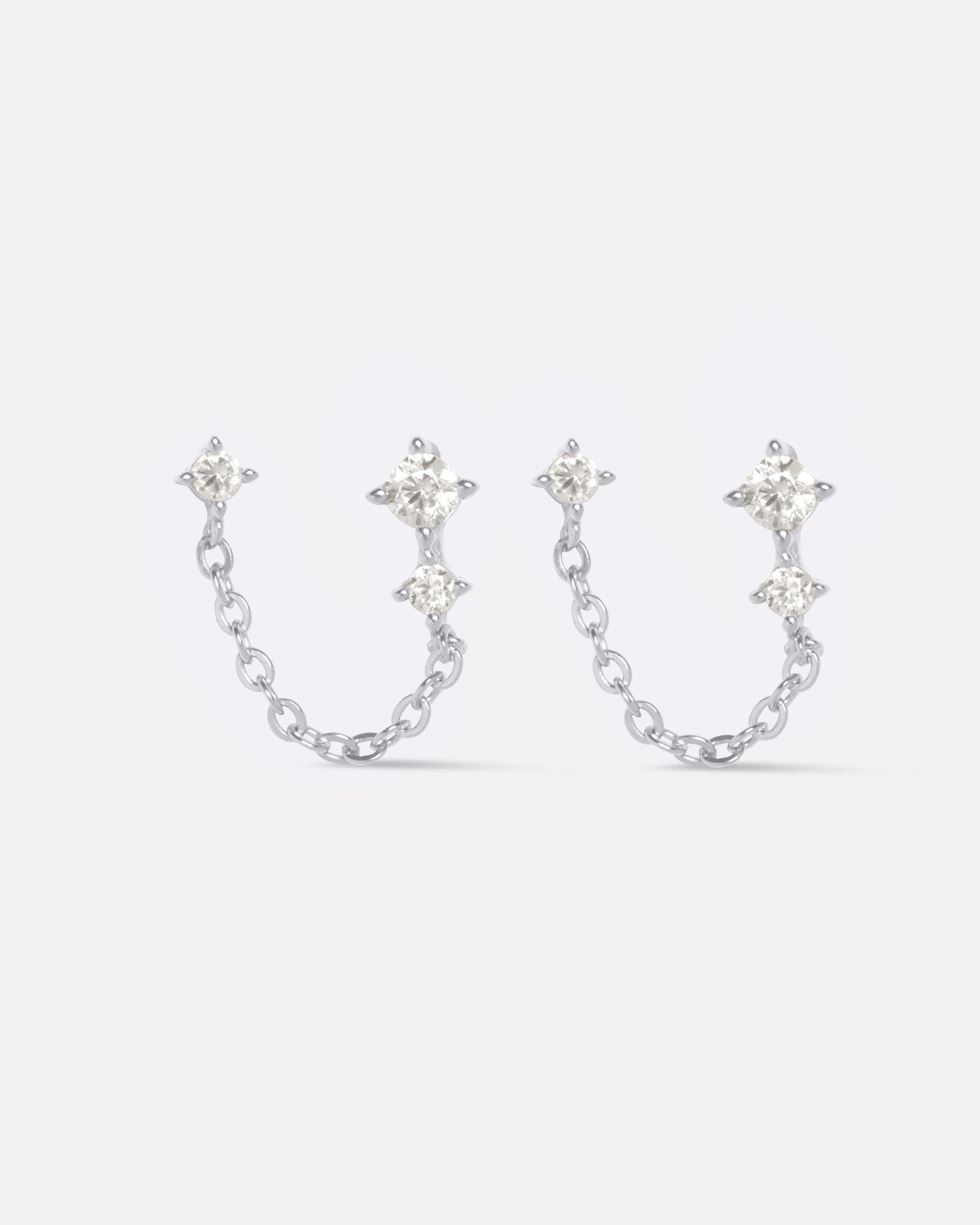 Zirconia Three Stone Chain Connector Earrings in 92.5 sterling silver with 5A+ zirconia stones. Rhodium plated, featuring three sparkling stones on a sleek layered chain for modern sophistication, perfect for daily wear or gifting.