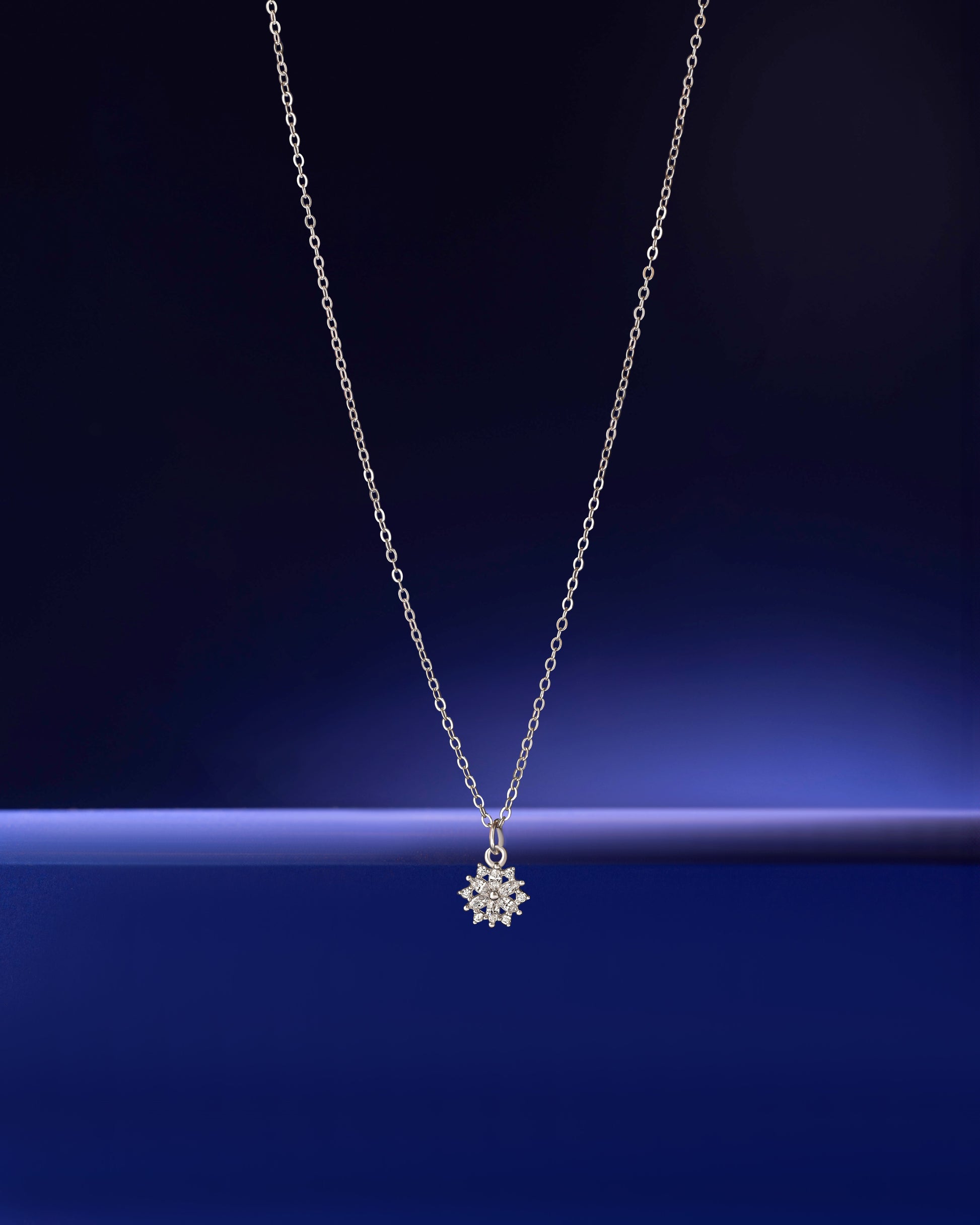 Ice Crystal Charm Necklace in 92.5 sterling silver with 5A+ zirconia stones. Rhodium plated for brilliance, this sparkling snow burst design captures winter elegance, perfect for layering or gifting during festive seasons.